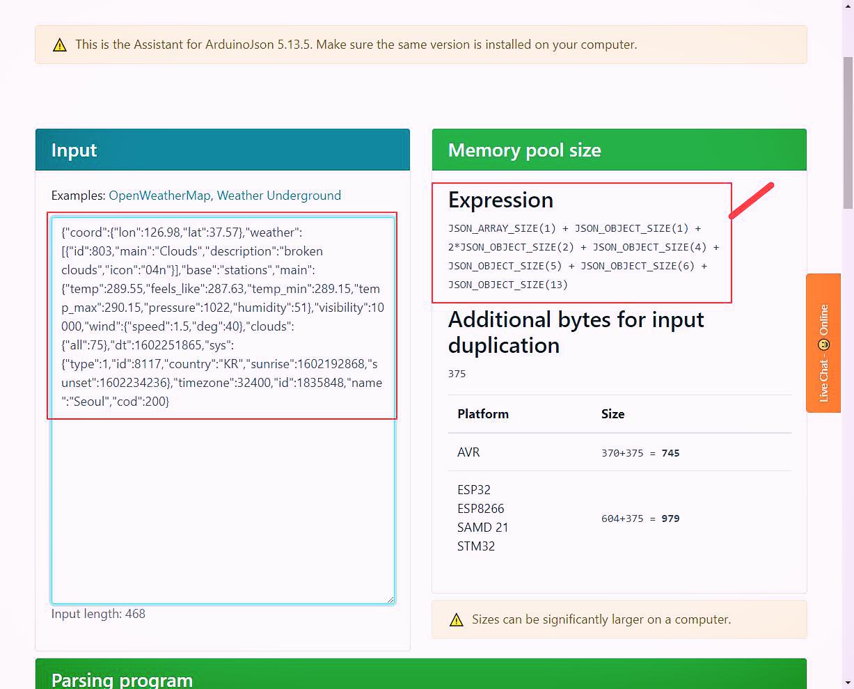 ArduinoJson Assistant로 이동하여 전체 OpenWeatherMap API 응답을 입력 필드에 복사합니다. 아래그림의 입력에 웨더맵에 요청하여 받은 데이터를 넣으면 메모리 할당 구문이 생성됩니다.