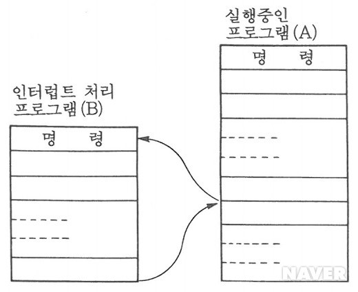 실행 중인 프로그램을 일시 중단하고 다른 프로그램을 끼워 넣어 실행시키는 것. 인터럽트 요인이 되는 조건이 생겼을 때 실행 중인 프로그램(A)을 중단하여 강제적으로 특정한 주소로 제어를 옮기고, 준비되어 있는 인터럽트 처리 프로그램(B)을 실행시키며, 그 처리가 끝나면 원래의 프로그램으로 되돌아가서 계속 실행시킨다. 프로그램 처리의 효율화, 입출력 장치의 동시 동작 온라인 처리의 효율화를 기할 수 있다. 인터럽트 요인의 종류로는 입출력 종료 인터럽트, 프로그램 인터럽트, 감시 프로그램 호출, 장해 인터럽트 등이 있다. (전자용어사전, 1995. 3. 1., 월간전자기술 편집위원회)