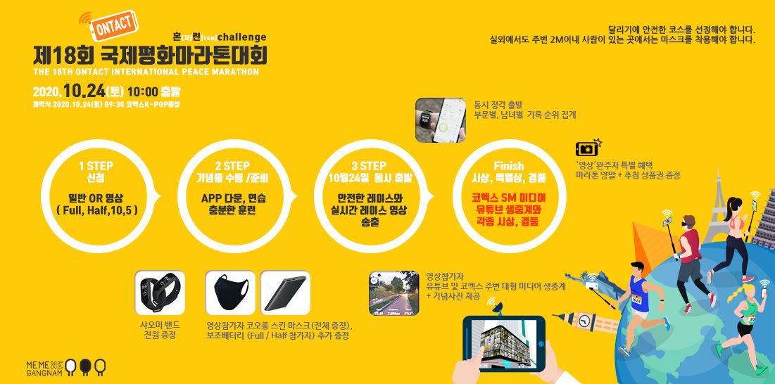 제18회 ONTACT 국제평화마라톤대회는 참가 신청부터 대회 진행까지 온택트(ONTACT)로 진행됩니다. * 코로나19로 인하여 이번 대회는 참가자 혼자 달리며 온라인에서 다 같이 만납니다.
