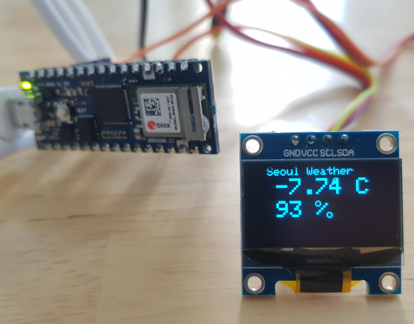 Nano 33 IoT 보드를 사용하여 원하는 도시의 온도와 습도 정보를 보여줍니다. 날씨 정보를 뽑아오는 상세한 설명은 참고 자료의 사이트를 참고합니다. 세계 어떤 지역의 날씨를 보여줄 수 있습니다. 아래 첨부한 잘 돌아가는 코드를 참고하세요.
