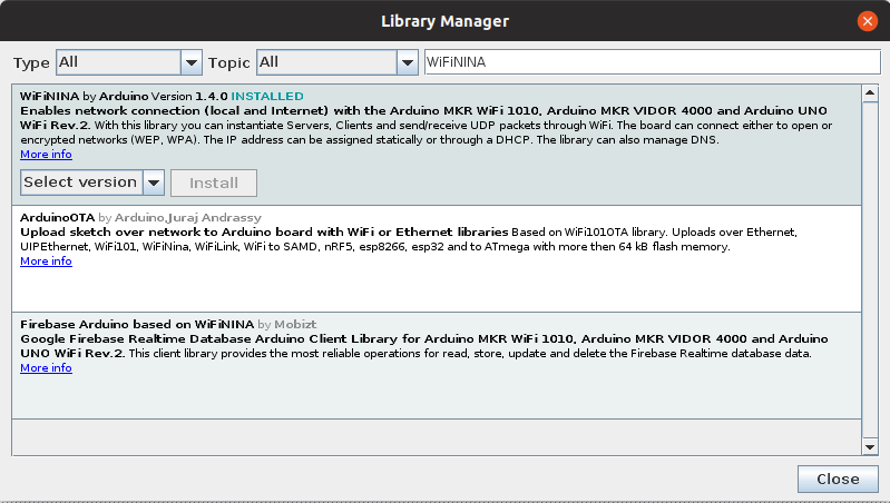 3. WiFiNINA 라이브러리를 검색하고 컴퓨터에서 사용 가능한 최신 버전을 설치합니다. 보드의 펌웨어 버전이 라이브러리와 일치하는지 확인하십시오. 펌웨어 업데이트가 필요한 경우 다음 유틸리티를 사용하십시오.