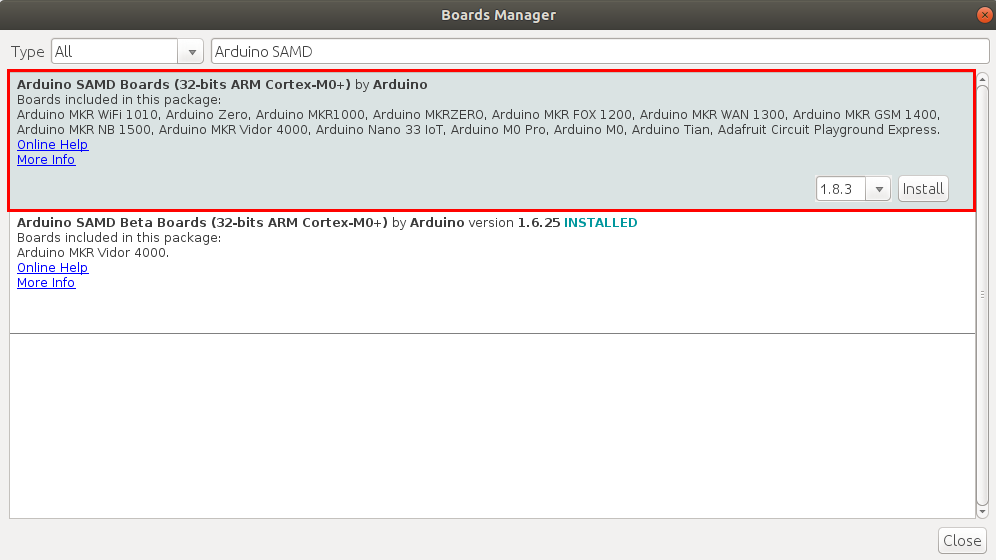 4. 도구> 보드> 보드 관리자에서 보드 관리자로 이동하여 "Arduino SAMD"를 검색합니다. “Arduino Nano 33 IoT”가 나열된 것을 설치하십시오.