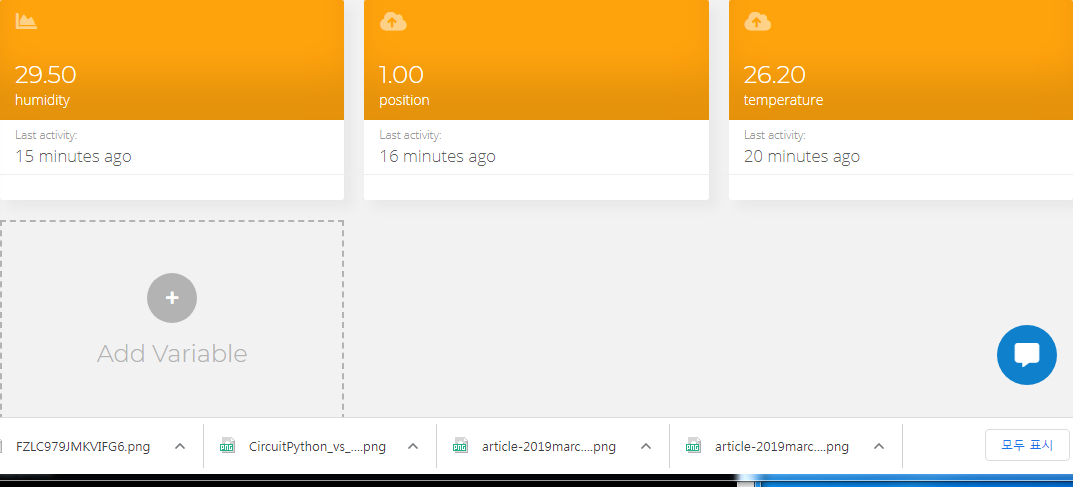 ubidots 사이트의 디바이스에서 본 데이터 입니다. 정확하게 1분 마다 측정한 온도와 습도 값이 입력됩니다.