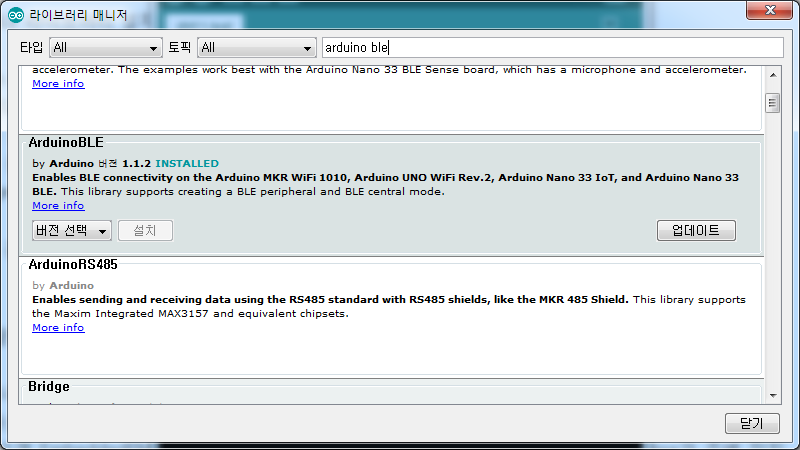 Bluetooth LE를 위한 몇 가지 Arduino 라이브러리가 있습니다. 일반적으로 하드웨어에 따라 다릅니다. 예를 들어 ESP32에서 Bluetooth LE를 사용하려면 다른 라이브러리가 필요합니다. 당면한 문제로 돌아갑니다. BLE가 장착된 Arduino 보드 작업을 위한 공식 라이브러리는 다음과 같습니다. IDE에서 라이브러리 관리자를 열어 검색창에 Arduino BLE로 검색하셔서 설치해 주시면 됩니다.