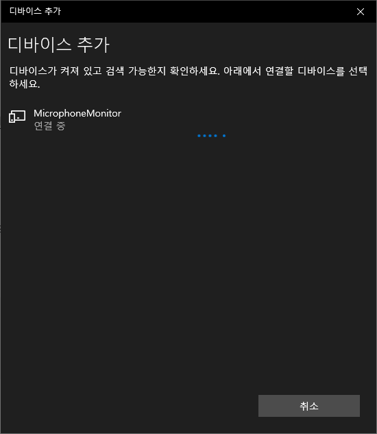 아래 화면은 노트북 BLE를 켜고 장치를 연결하는 중인 화면인데 nano ee ble sense 보드에서는 연결 되었다고 나오는 데 노트북에서는 계속 장치를 찾습니다. 딱히 해 볼 게 없는데 노트북 Bluetooth는 끄고 테스트 하시기 바랍니다. 참고하시라고 올려둡니다.