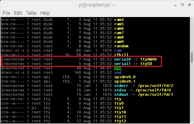 하드웨어 UART 포트, 즉 GPIO14 (TXD) 및 GPIO15 (RXD)는 serial0 이라고도하며 Bluetooth 모듈에 연결된 다른 UART 포트는 serial1 로 알려져 있습니다 . 이러한 이름은 Raspberry Pi 버전 이식성을 위해 직렬 별칭으로 생성됩니다.
