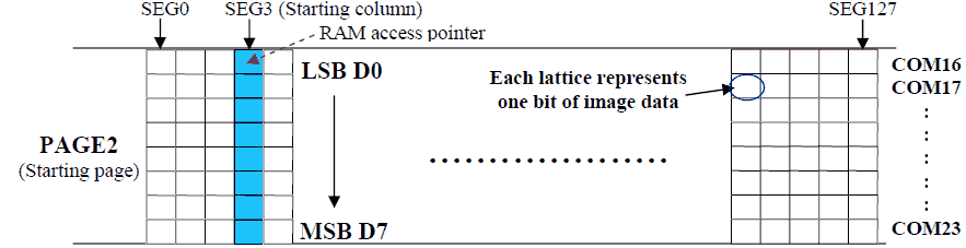 예를 들어 페이지 주소가 B2h로 설정되어 있고 하단 열 주소가 03h이고 상단 열 주소가 10h이면 시작 열이 PAGE2의 SEG3임을 의미합니다. RAM 액세스 포인터는 그림과 같이 위치합니다. 입력 데이터 바이트는 열 3의 RAM 위치에 기록됩니다.