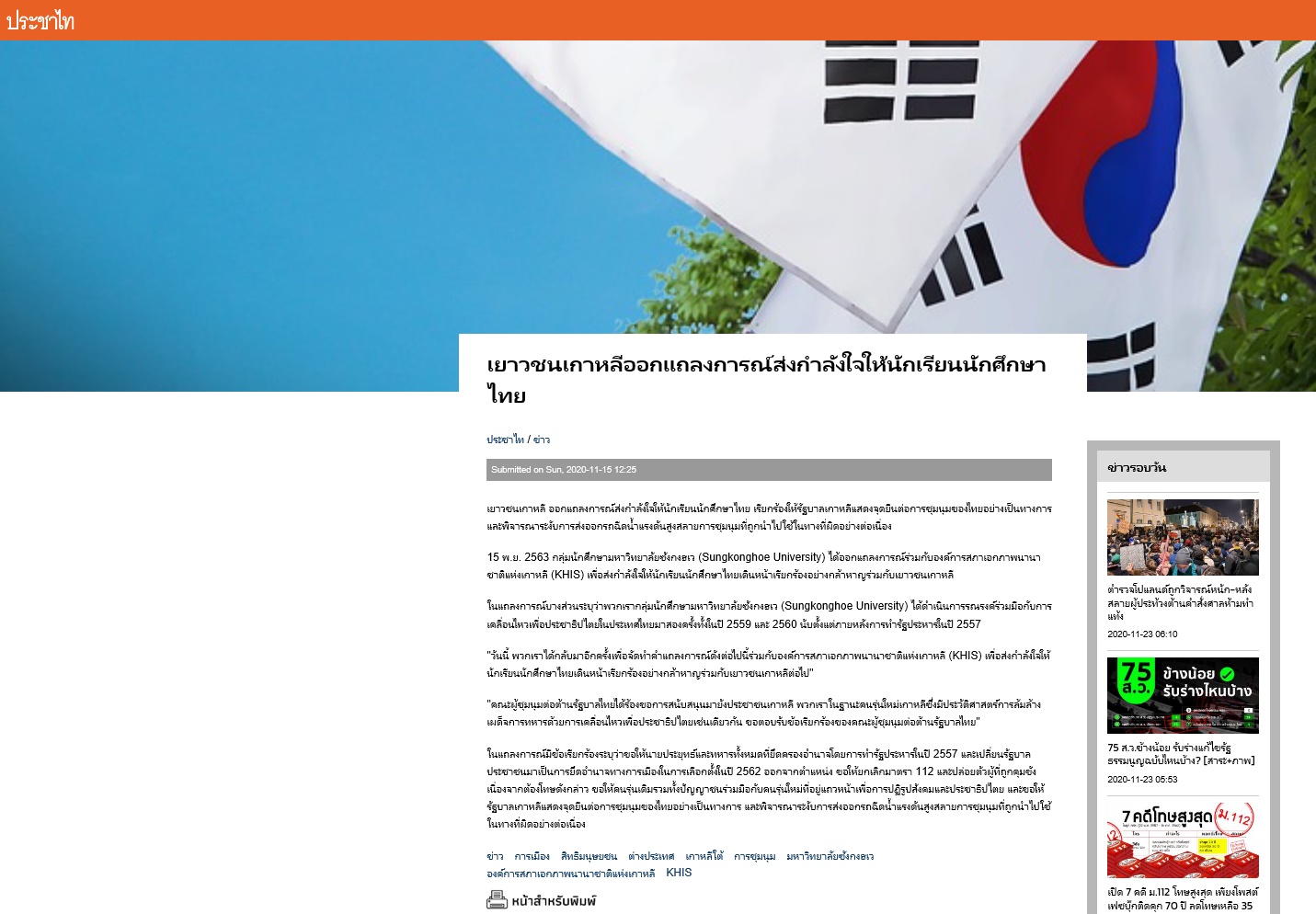 ※ 태국 현지 언론 ‘프랏차타이’ 기사(2020-11-15):