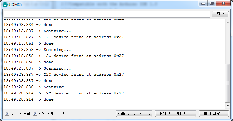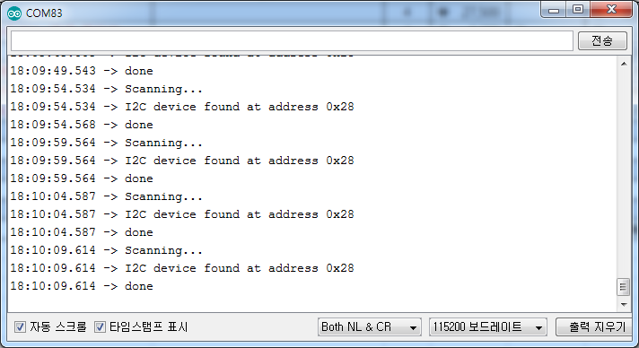 예제를 불러오면 i2c 주소는 0x28로 아예 설정되어 있습니다. 굳이 i2c 주소를 확인하시려면 i2c scanner 코드를 불러와 실행하면 i2c 주소를 볼 수 있습니다. 아래 이미지는 위쪽은 미세먼지 센서의 i2c주소이고 아래 이미지는 i2c LCD의 i2c 주소를 보여줍니다. 우선 i2c 스캔 코드는 아래와 같고 테스트가 필요 없으면 그냥 진행하세요.