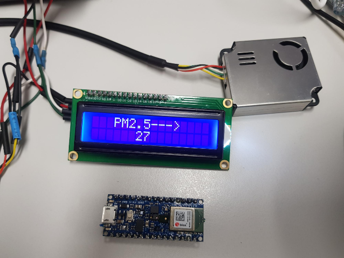 11조 작품인 공기청정기 이동 로봇에 들어가는 Nano 33 BLE Sense 보드, PM2008M 미세먼지 센서와 Liquid Crystal LCD를 연결하여 미세먼지 센서 값을 나타냅니다. 연결이 좀 복잡할 것 같은 예감이 듭니다. Nano 33 BLE Sense 컨트롤 보드는 3.3V로 동작합니다. 미세먼지 센서를 다짜고짜 3.3V전원을 연결하니 잘 동작하네요. 남은 것은 16*2 캐릭터 LCD인데 5V에서 동작합니다. 그래서 보드 뒷면에 USB 전원을 쓸 때 연결해 주면 5V가 출력되는 핀을 LCD 전원으로 연결해 동작하니 이상 없이 잘 디스플레이됩니다.