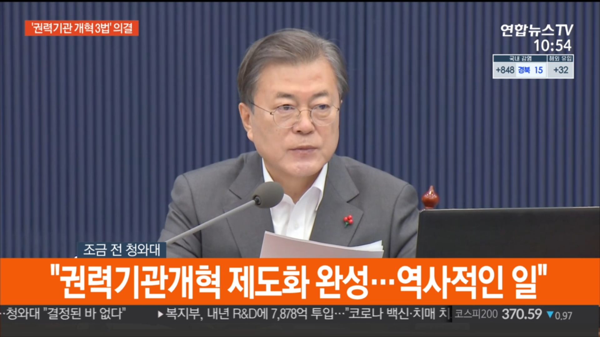 오늘 국무회의를 거쳐 공수처 관련법, 경찰법, 국정원법 등 국회가 진통 끝에 입법한 권력기관 개혁법률들을 공포하게 됩니다. 한국 민주주의의 오랜 숙원이었던 권력기관 개혁의 제도화가 드디어 완성됐습니다. 오랜 기간 권력기관에 의한 민주주의 훼손과 인권 침해를 겪어왔던 우리 국민들로서는 참으로 역사적인 일이 아닐 수 없습니다. 저 또한 국민과의 약속을 지킬 수 있어서 감회가 깊습니다. 모든 권력기관이 견제와 균형의 원리에 의해 작동되고 오로지 국민을 섬기는 국민의 기관으로 거듭나는 초석이 될 것입니다.