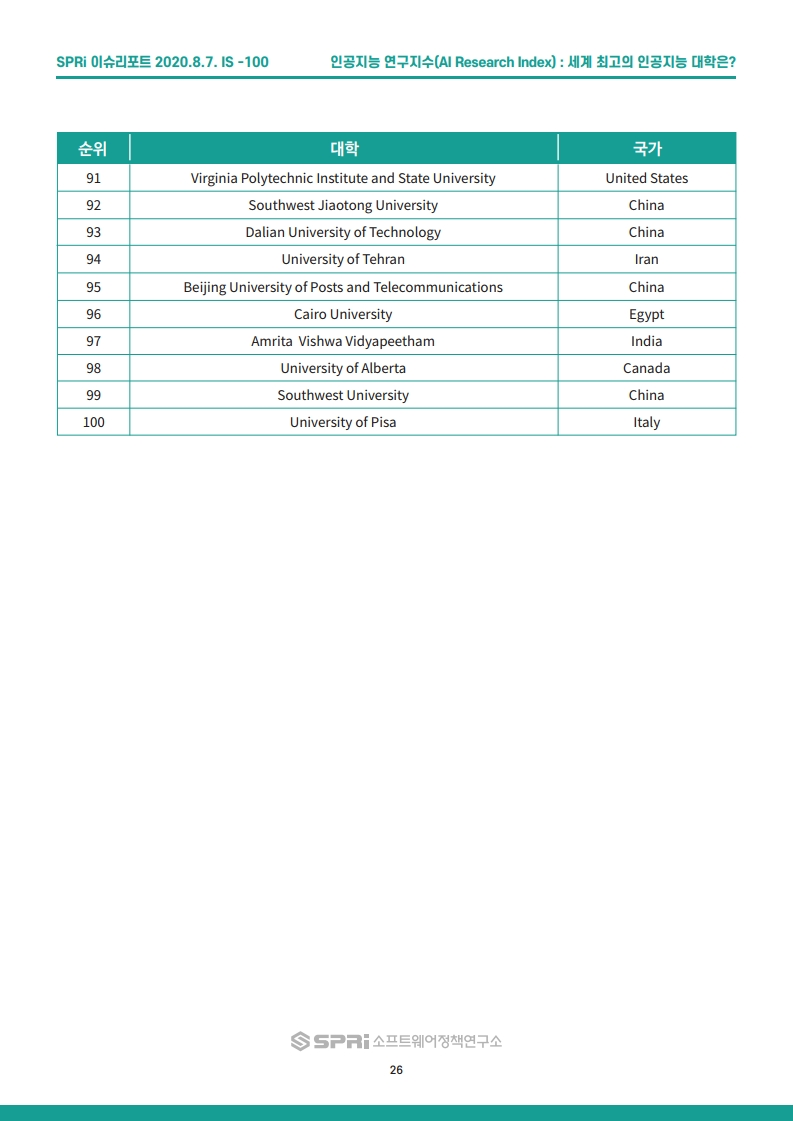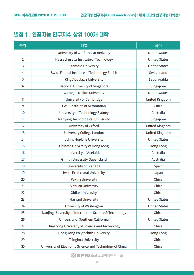 이 보고서는 소프트웨어정책연구소에서 수행한 연구보고서를 요약한 자료입니다. 자료 링크는 인공지능 연구지수 ( AI Research Index ) : 세계 최고의 인공지능 대학은? (기술동향자료)
