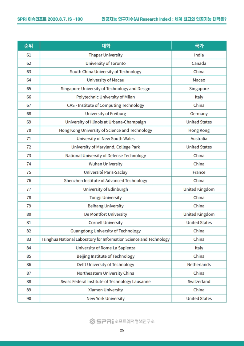 - 인공지능 연구 수를 기준으로 세계 상위 500개 대학을 1차 선정하고, 변수의 양·질, 가중치를 고려하여 분석[국내 대학 데이터는 미반영]