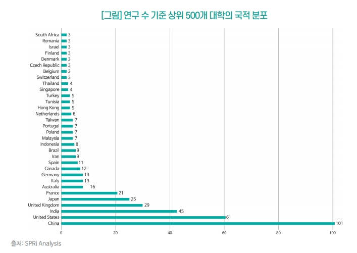인공지능 연구 수를 기준으로 세계 500개 대학을 1차 선정한 결과, 이들 대학은 4년 동안 평균 404건의 연구를 수행하는 것으로 나타났다. 500개 대학의 국적을 보면, 중국 101개(20.2%), 미국 61개(12.2%), 인도 45개(9.0%), 영국 29개(5.8%), 일본 25개(5.0%), 프랑스 21개(4.2%)로 분석되었다. 성과지표의 양과 질을 모두 고려하여 인공지능 연구지수를 측정한 결과, 500개 대학의 연구지수 평균은 46.01점으로 측정되었다. 인공지능 연구지수 상위 100개 대학의 평균은 67.26으로 500개 대학과 차이가 존재했으며, 100개 대학 중에서 중국, 미국, 영국 대학 등의 비중이 높은 것으로 나타났다. 인공지능 연구지수 상위 10개 대학 측면에서는 미국이 40%로 매우 높게 나타났다.