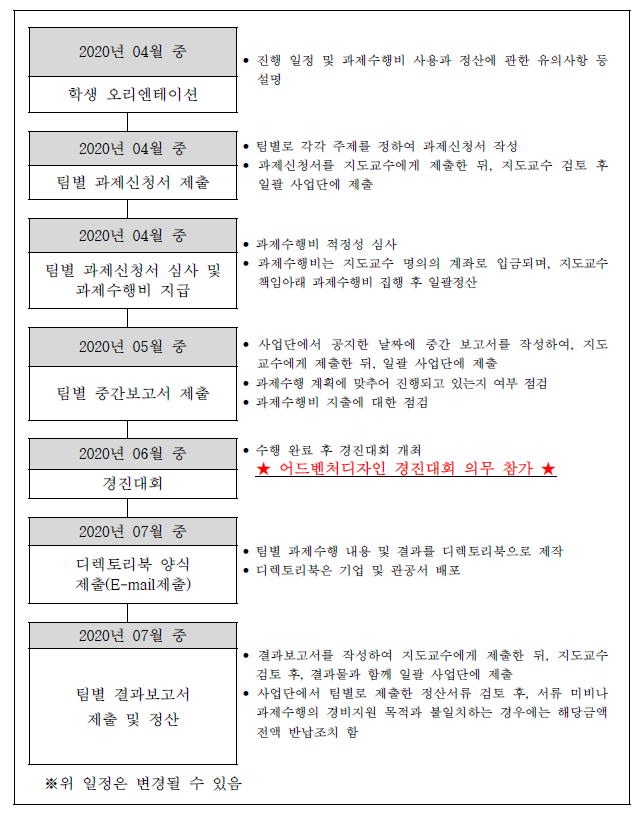 어드벤처 디자인의 교과목 추진 계획은 학사일정에 맞추어 가능한 일정으로 진행할 수 있으며, 반드시 제출보고서, 평가자료, 경진대회에 관련된 절차와 문서의 작성이 필요함.