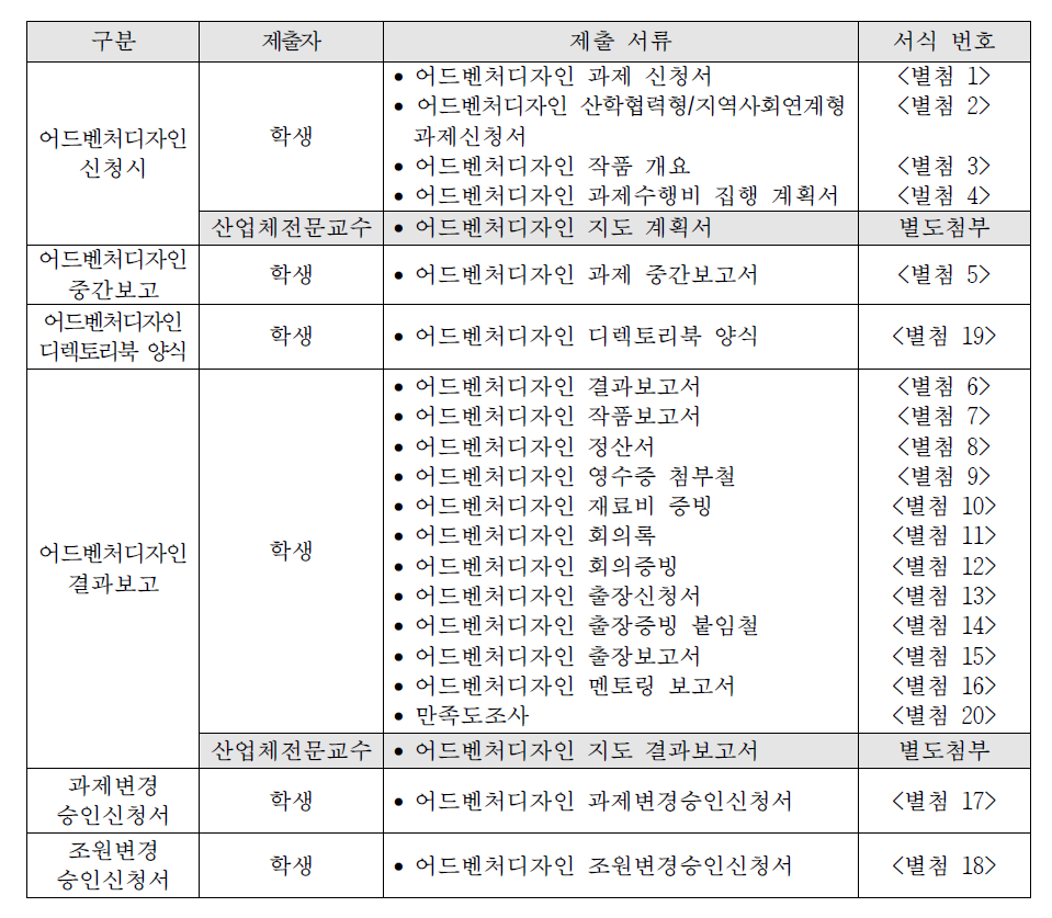 - 팀 구성 후, 팀별 어드벤처디자인 과제신청서 및 관련서류를 작성하여 지도 교수에게 제출