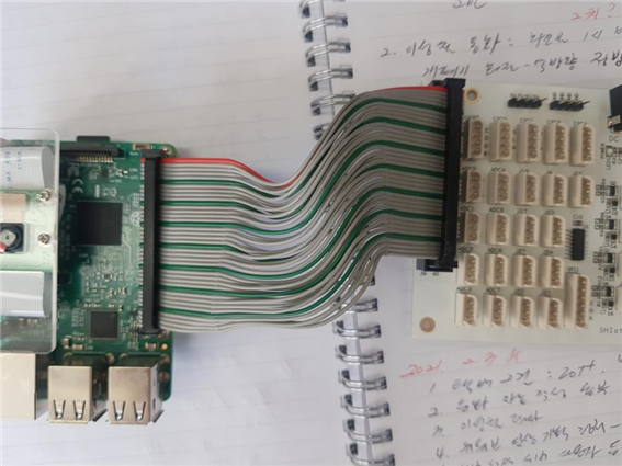 1. 라즈베리파이와 인터페이스 모듈 연결하는 40 pin 플랫 케이블은 따로 주문 제작해야 합니다. 아래 그림처럼 연결하여 사용합니다.