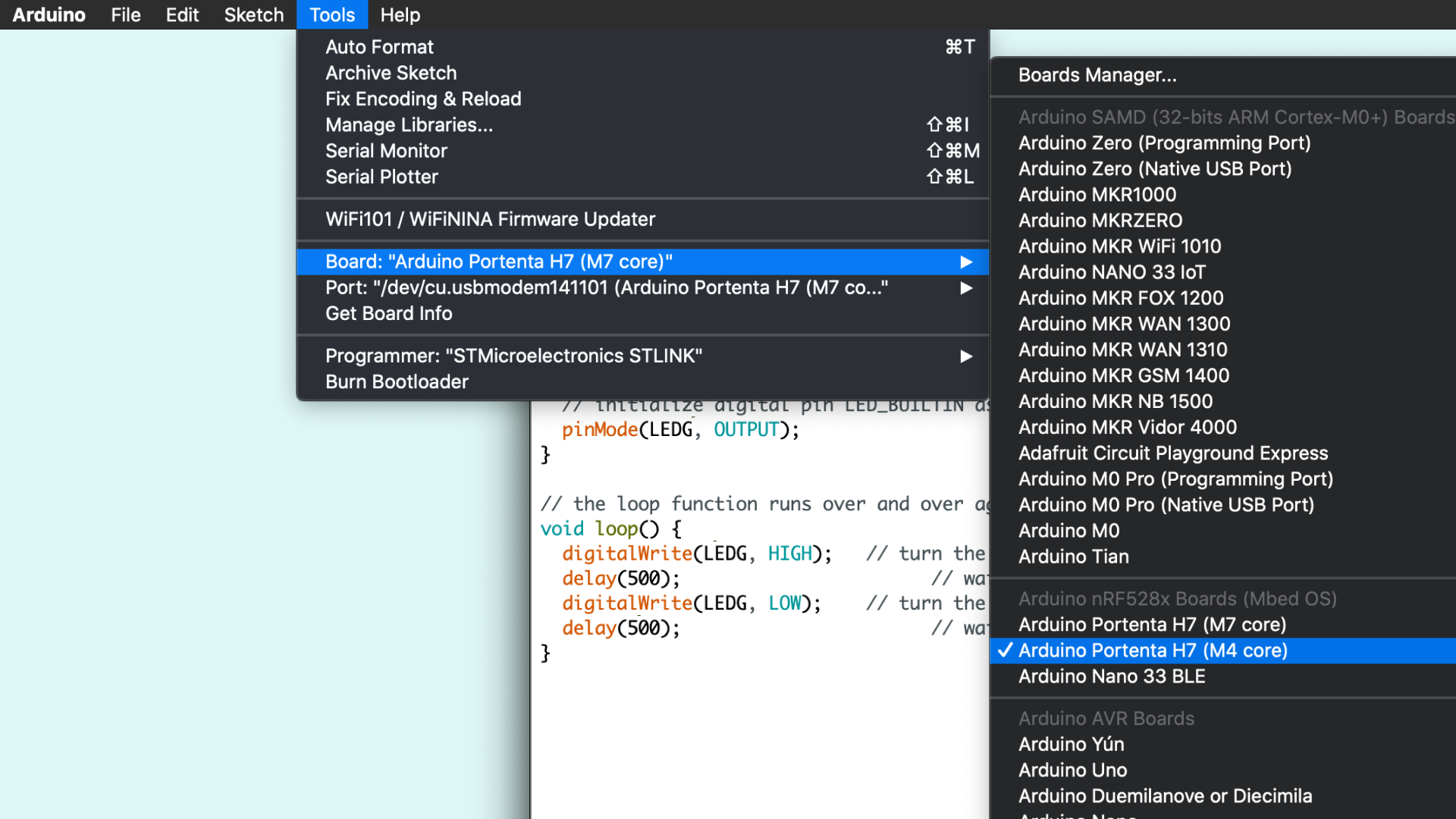 그런 다음 setup() 기능 내부뿐만 아니라 M4 코어의 녹색 LED를 올바르게 구성하려면 다음 라인을 포함해야 합니다.