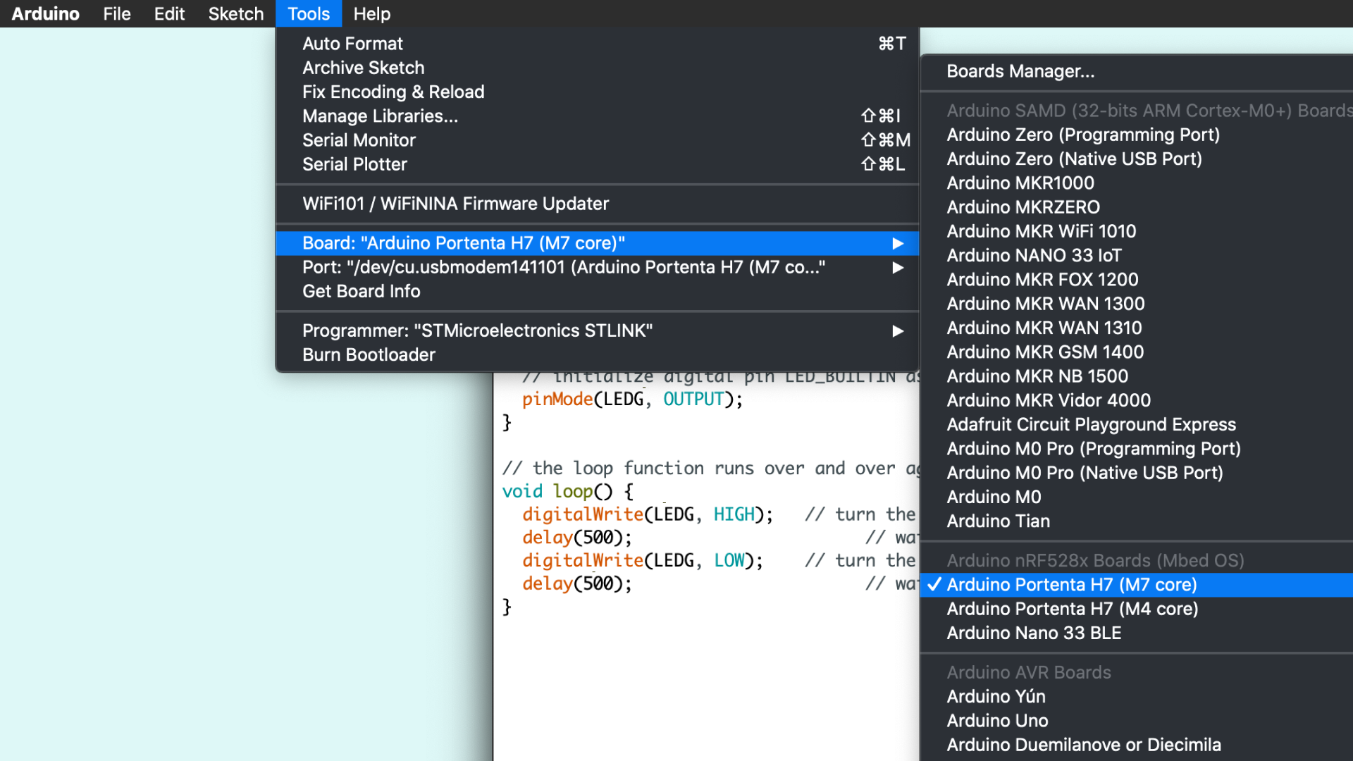 보드 메뉴에서 Arduino Portenta H7 (M7코어)을 선택하고 Portenta가 연결된 포트 (예 : /dev/cu.usbmodem141101)를 선택합니다. BlinkRedLed_M7.ino 스케치를 업로드합니다. 이렇게 하면 미리 스케치가 자동으로 컴파일됩니다. 스케치가 업로드되면 보드의 RGB LED가 빨간색으로 깜박이기 시작합니다.