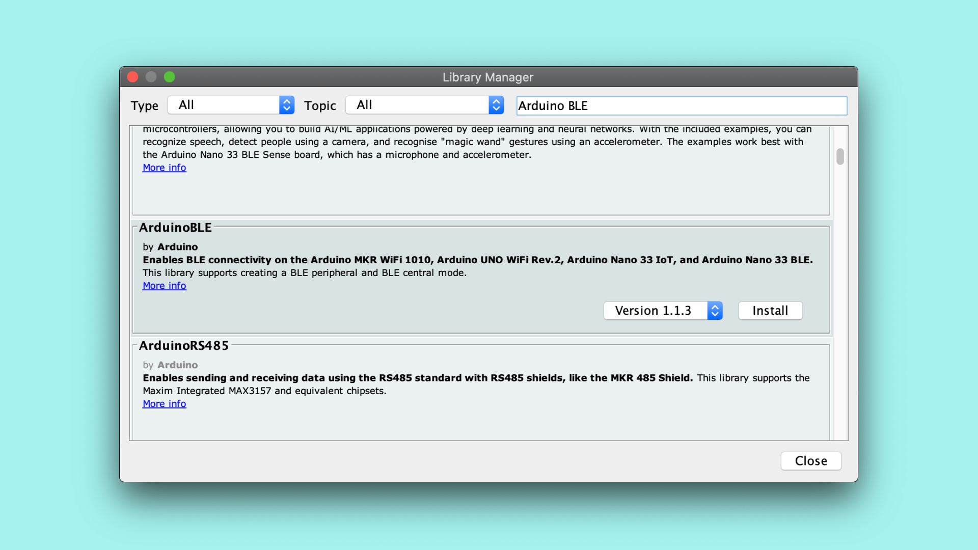 사용 중인 Arduino IDE에 ArduinoBLE 라이브러리를 설치해야 합니다. 이 예에서는 고전적인 Arduino IDE를 사용합니다. 에 라이브러리 이동 설치하려면 : 도구 -> Libararies 관리... 입력 ArduinoBLE을 클릭 설치합니다. ArduinoBLE 버전 1.1.3 이상을 설치해야 합니다.