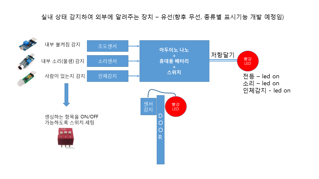 아침에 바쁘든 바쁘지 않든 가끔 자주 욕실의 등을 켜두고 나온다. 집이 넓지 않고 문이 다 열려 있으므로 방의 불을 전부 끈다. 화장실이 방 앞에 있어 습관적으로 화장실 문을 닫아두는데 퇴근 하고 와보면 화장실 불이 켜져 있다. 그래서 욕실이나 창고와 같이 내부가 직접 보이지 않는 곳의 내부 상태, 간단하게 사람이 있는지 없는지, 전등이 켜져 있는지, 소리가 나는지 상태를 외부에 알려주는 장치를 만든다. 초기에 그려본 구성 블럭도를 첨부하니 참고하기? 안 하기?