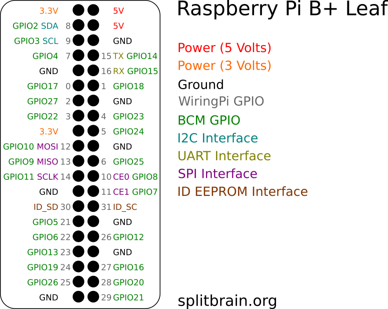 Raspberry B +의 40 핀 GPIO 핀 할당 표입니다. 그것을 인쇄하고, 선택적으로 라미네이팅 하고, 구멍을 뚫어 라즈베리의 GPIO 핀 위로 밀어 넣습니다. 작업이 훨씬 쉬워집니다. Leaf는 원래 Broadcom 번호가 매겨진 GPIO (녹색)와 WiringPi에서 사용하는 하드웨어 독립 핀 번호 (회색)를 보여줍니다. 저장소에는 원본 Inkscape SVG와 쉬운 인쇄를 위한 DIN A4 PDF 버전이 포함되어 있습니다. 필요에 따라 자유롭게 조정하십시오.