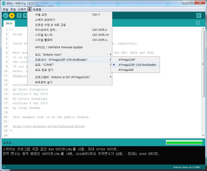 아두이노 나노 예전 보드에 코드 업로드할 때 에러나고, 코드 업로드 시간이 오래 걸리다가 결국 오류 메시지 발생하는 현상은 아래 방법으로 해결하시면 됩니다.