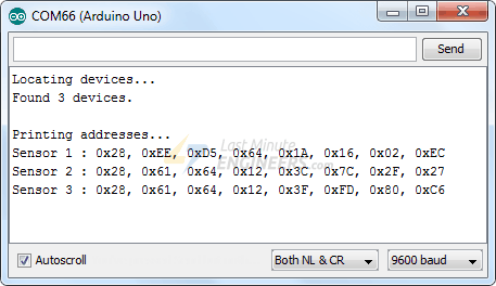 아래 스케치는 버스에 있는 모든 DS18B20을 감지하여 직렬 모니터에 단선 주소를 인쇄합니다. 각 센서의 주소를 찾아 이름을 지정할 수 있도록 한 번에 하나의 센서만 연결할 것을 권장합니다.