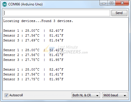 코드의 루핑 섹션에서는 요청 온도() 함수를 사용하여 버스에 있는 모든 센서에 온도 변환을 수행하도록 지시합니다. 마지막으로 간단한 for 루프를 사용하여 센서 배열을 반복하고 getTempCByIndex(i) 함수를 호출하여 특정 DS18B20의 온도를 읽습니다.