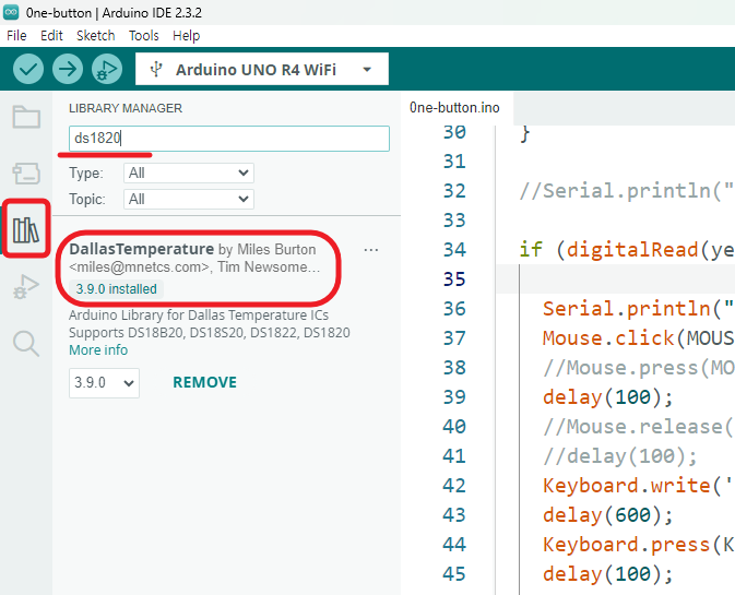 'ds18b20'을 입력하여 검색을 필터링합니다. 몇 개의 항목이 나올 것입니다. Miles Burton의 DallasTemperature를 찾습니다. 해당 항목을 클릭한 다음 설치를 선택합니다.
