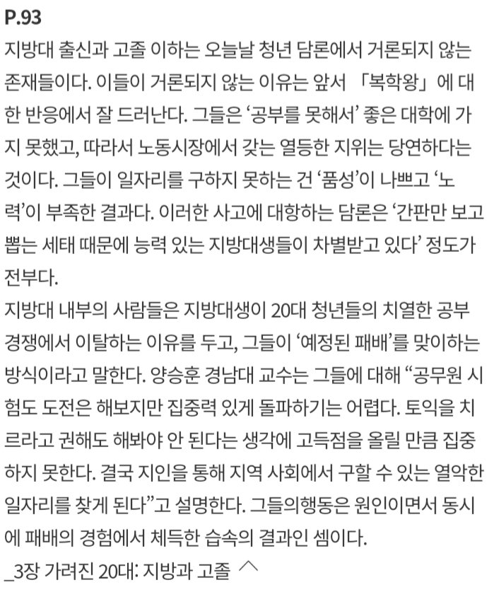 “지방대 출신과 고졸 이하는 오늘날 청년 담론에서 거론되지 않는다. 그들은 ‘공부를 못해서’ 좋은 대학을 가지 못했고, 따라서 노동시장에서 열등한 지위를 갖는 것은 당연하다는 것”