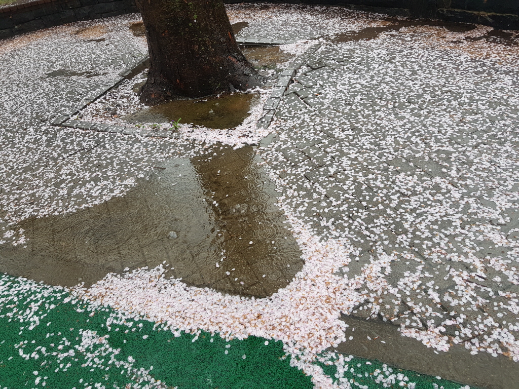 오늘 훈련은 3시간주인데 뜻하지 않게 다 채웠다. 뜻하지 않게 대공원에서 돌아오는 길에 막걸리와 파전 외상 술을 먹고, 뜻하지 않게 벚꽃 만발한 양재천과 서울 대공원을 달렸다. 반짝반짝 빛나는 4월의 꽃과 봄비를 세차게 맞고 꽃잎 강물을 보며 달렸다. 올해 들어 두 번째 우중주였다. 봄비에 폭포처럼 떨어지는 꽃을 걱정하지 않았다. 남김없이 핀 벚꽃으로 뒤덮인 양재천과 대공원은 아름다웠고 우리는 아름다우면 그걸로 끝이었다. 영동 1교 아래에 모였고 오늘 훈련 임무는 3시간 시간주(거리와는 상관없이 일정한 시간 동안 달리는 것)였다.