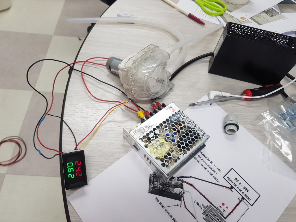 아래는 테스트 완료 이미지고, 다이어그램 2와 같이 정확히 연결하여 테스트 했더니 0.6A 정도 모터가 쓴다. 적은 양 같기도 하고, DC 모터에 힘이 없는 듯하여 토크가 강한 모터를 사용하여 속도 제어를 통해 펌프 속도 제어를 해야겠다.