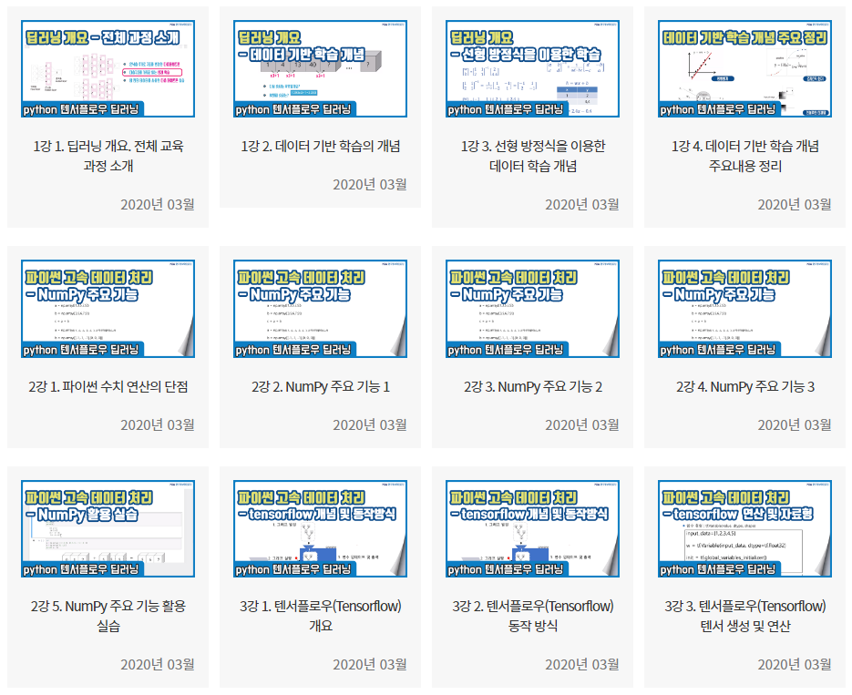 빅데이터 센터에서 제공하는 딥러닝 강의 영상을 링크로 올려둔다. 사방으로 뻗어나오는 관심을 줄이고, 집중하는 길이 목적지에 가장 빨리 도착하는 방법이다. 기본이 되었다면 방법은 한마리 씩이 두번째고, 세번째는 끝까지다. 이건 공식이라서 외우고 몸으로 확인하는 수 밖에 없어.