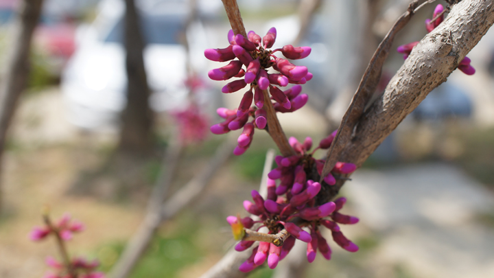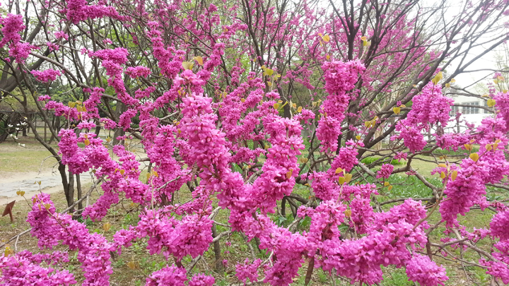 (콩과에 속하는 나무로 가지마다 진분홍색 꽃이 가득 피는 나무. 영어로는 judas tree 라고 하는데 성경에 나오는 유다가 예수를 팔고 이 나무에 목을 맸다는 데서 유래했다고 한다.)