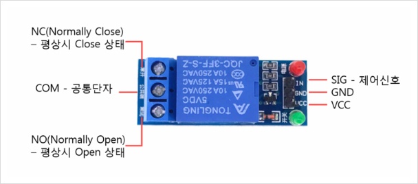 외부 전원을 사용하고 5V로 구동하는 릴레이를 사용하려고 하는 경우에 어떻게 5V를 사용하는지 회로 구성을 보여준다.