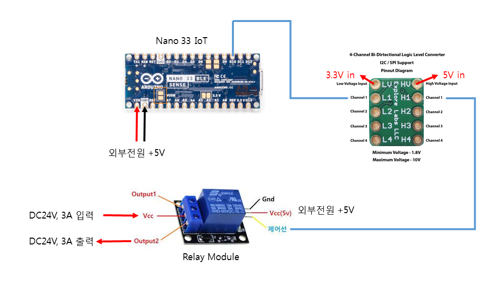 또 결론을 말씀드리면 나노 33 IoT에서 3.3V 출력으로 릴레이를 제어하면 동작은 할지 모르지만 보장을 못한다는 말입니다. 결국 레벨 쉬프터를 사용하지 않고 3.3V 릴레이를 사용했고요. 릴레이는 보통 커런트로 동작하기 때문에 3.3V 출력을 트랜지스터를 거쳐 사용하시면 동작 잘할 겁니다.
