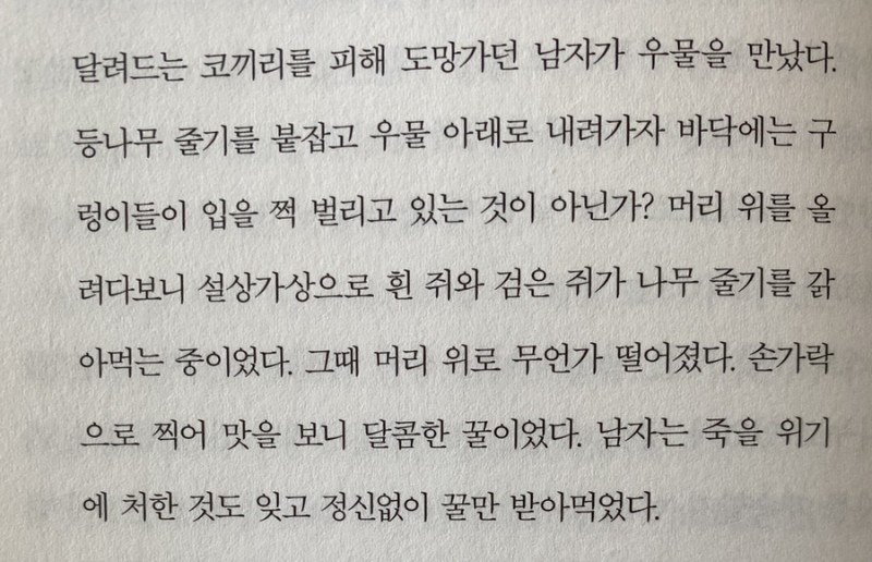 불교 경전에 나오는 ’안수정등’이란 우화, 이 상화에서 살아남는 방도는 줄을 타고 올라가 코끼리와 싸우는 수밖에 없다. 내게 드리우는 두려움 속에 안주할 것이 아니라 이겨내야 하는 것이다.
