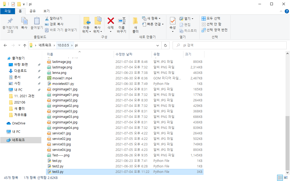 ~ $ ls 명령으로 파일 이름이 모두 나오는데 수정이 필요한 파일은 test3.py 파일과 앞으로 설명할 이미지 파일이다. 아래 이미지의 파일 이름을 참고한다.