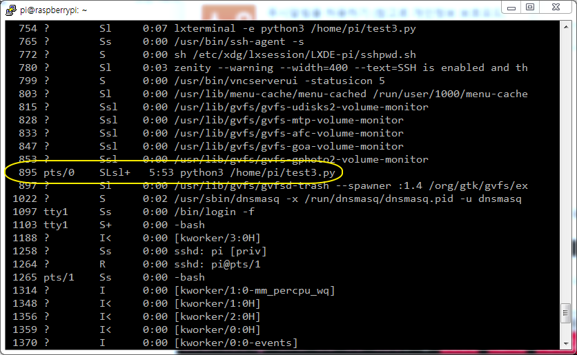 PID를 찾았으면 $sudo kill -9 895 명령으로 test3.py 프로세스를 강제로 종료한다. 다시 $ps -ax 로 보면 보이지 않는다. 이렇게 하면 연결이 끊기거나 속도가 늦은 문제를 해결하는데 꼭 할 필요는 없다. 참고삼아 알아두기 바란다.