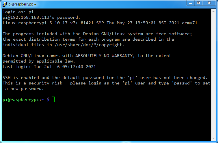 암호는 1234567890 을 입력하여 연결한다. 물론 인터넷은 연결되지 않으므로 데이터와 상관없이 일단 연결을 한다. 아래 이미지처럼 검은 화면이 뜨면 login as: 에는 사용자 이름인 "pi"를 입력한다. 아래 pi@10.0.0.5’s password: 에는 암호인 "raspberry"를 입력하는데 암호라서 입력하는 도중에 보이지 않아도 틀리지 않게 입력한다. 아래는 제대로 입력하여 성공적으로 로그인을 완료한 화면이다.