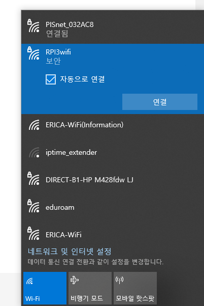 개발중인 라즈베리파이 전원을 넣으면 30초 후에 부팅이 된다. 노트북 전원을 켜고 와이파이를 검색하면 아래 이미지와 같이 SSID가 RPI3wifi 인 AP(Access Point)가 보인다.