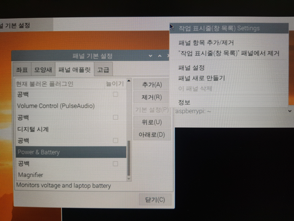 2. GUI 화면 작업 표시줄로 갑니다. 마우스 오른쪽 키를 누르고 메뉴에서 '패널 항목 추가/제거' 로 갑니다. 밑으로 좀 내려가서 'Power and Battery' 항목을 찾아서 제거합니다. 깔끔하게 해결합니다. ^^