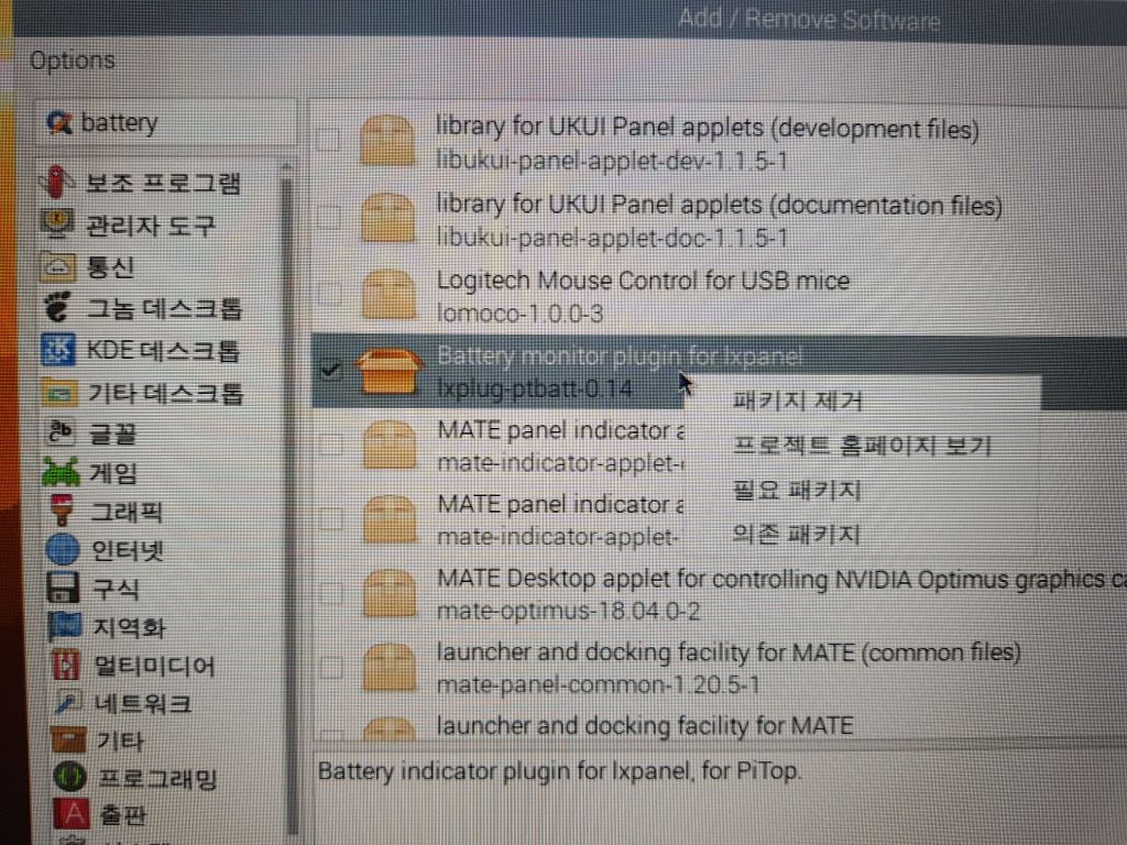검색어를 'Battery' 입력하여 "battery monitor plugin for lxpanel"란 이름을 가진 패키지를 찾는다. 찾아서 마우스 오른쪽 키를 누르고 제거하든가, 비활성화 하면 된다. 아래 이미지 참고하세요.