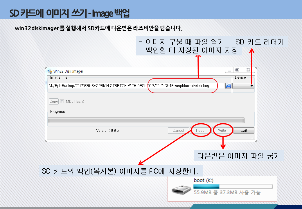 여기까지 하셨으면 SD카드 이미지를 백업해서 보관합니다. 가장 잘 동작하고, 필요한 모든 환경이 설정되어 있으니 이미지만 잘 구워 놓으면 다음부터 이 이미지를 구워서 사용하면 됩니다. 굽는 방법은 아래 이미지를 보시면 됩니다.