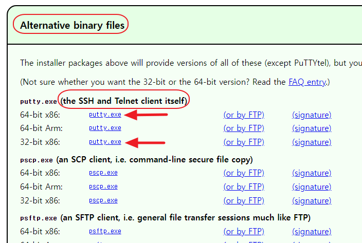 아래 이미지는 Putty 다운로드 받는 사이트 화면입니다. 화살표 보이지죠? 자기 컴퓨터 사양(여기서는 윈도우)에 맞는 버전을 다운 받아 적당한 폴더에 넣으세요. 바탕화면에 바로가기 아이콘을 만들어서 직접 실행하시면 됩니다.