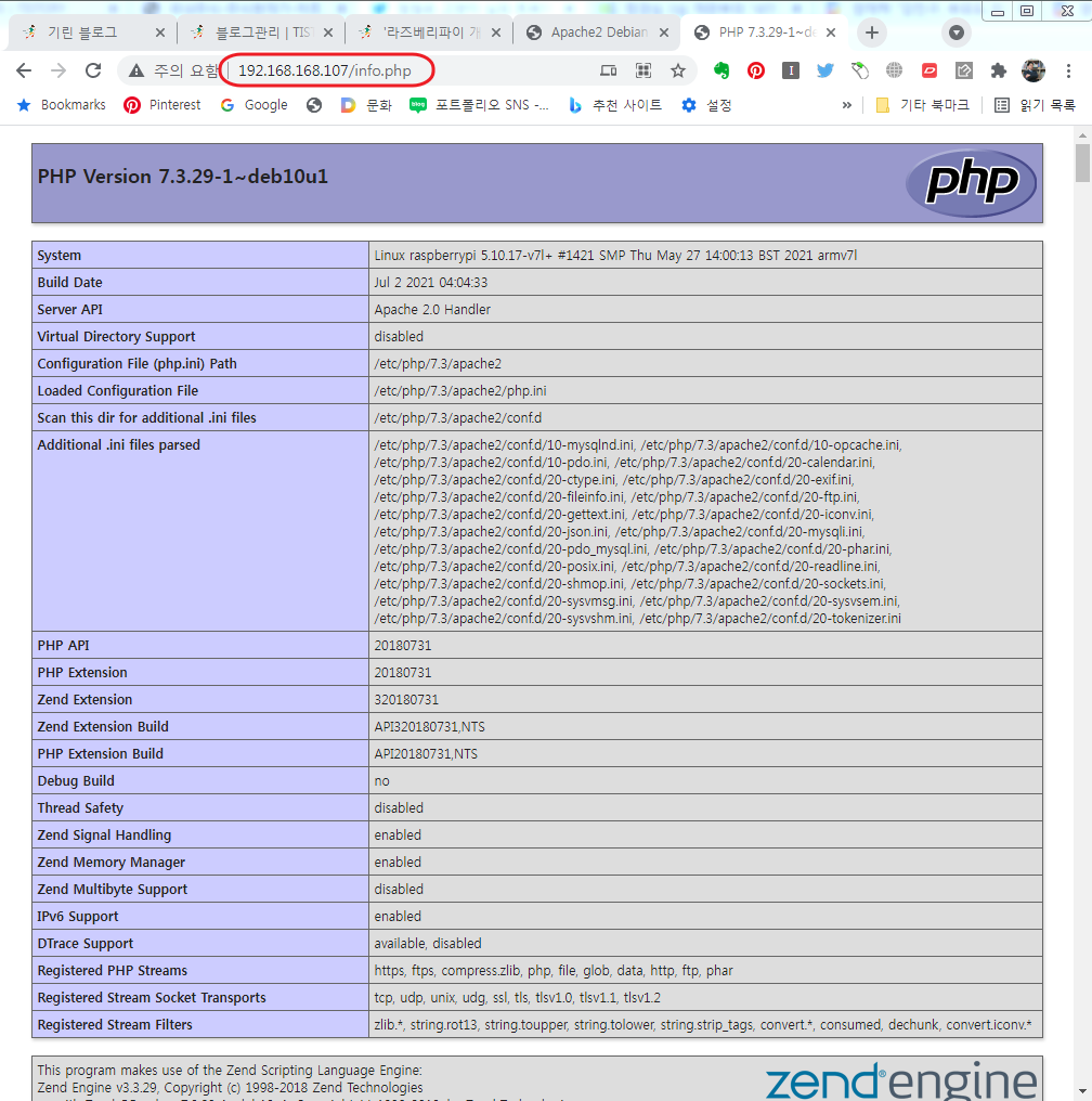 크롬 브라우저에서 라즈베리파이 IP 주소와 방금 작성한 info.php 파일을 주소줄에서 호출합니다.