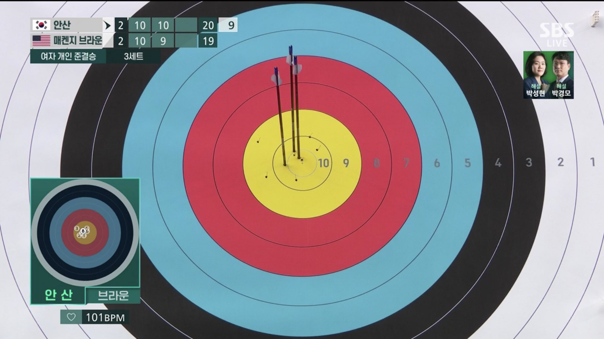 기보배 해설위원이 안산 선수는 할당된 20초를 다 안 쓰고 최대한 빠르게 활을 쏘는 게 특징이라고 함.. 그럼 그만큼 빠르게 상대에게 턴이 돌아감. 즉, 쉴 틈도 안 주고 9, 10을 찍어버리니 상대 선수에겐.. 봇나 무서운 상대라는 것이다.
