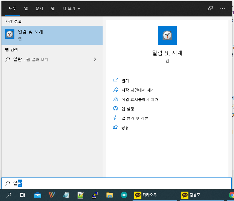 포모도로 기법을 사용하기 위해 토마토 타이머를 찾다가 컴퓨터에서 돌아가는 프로그램을 찾았다. 좌측 하단 검색 아이콘을 지긋이 누르고 "알람"을 입력하여 알람 및 시계를 찾아 실행한다.