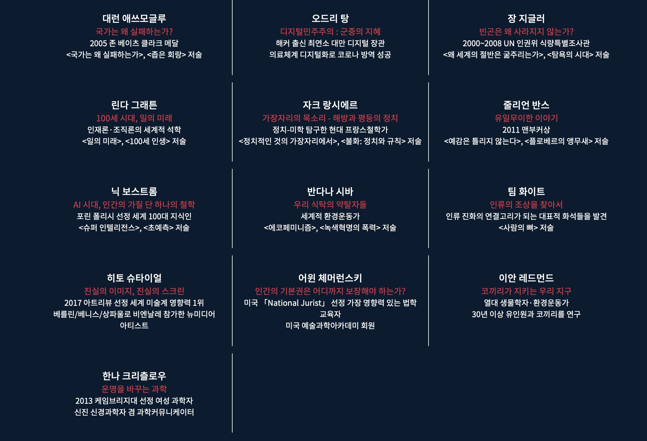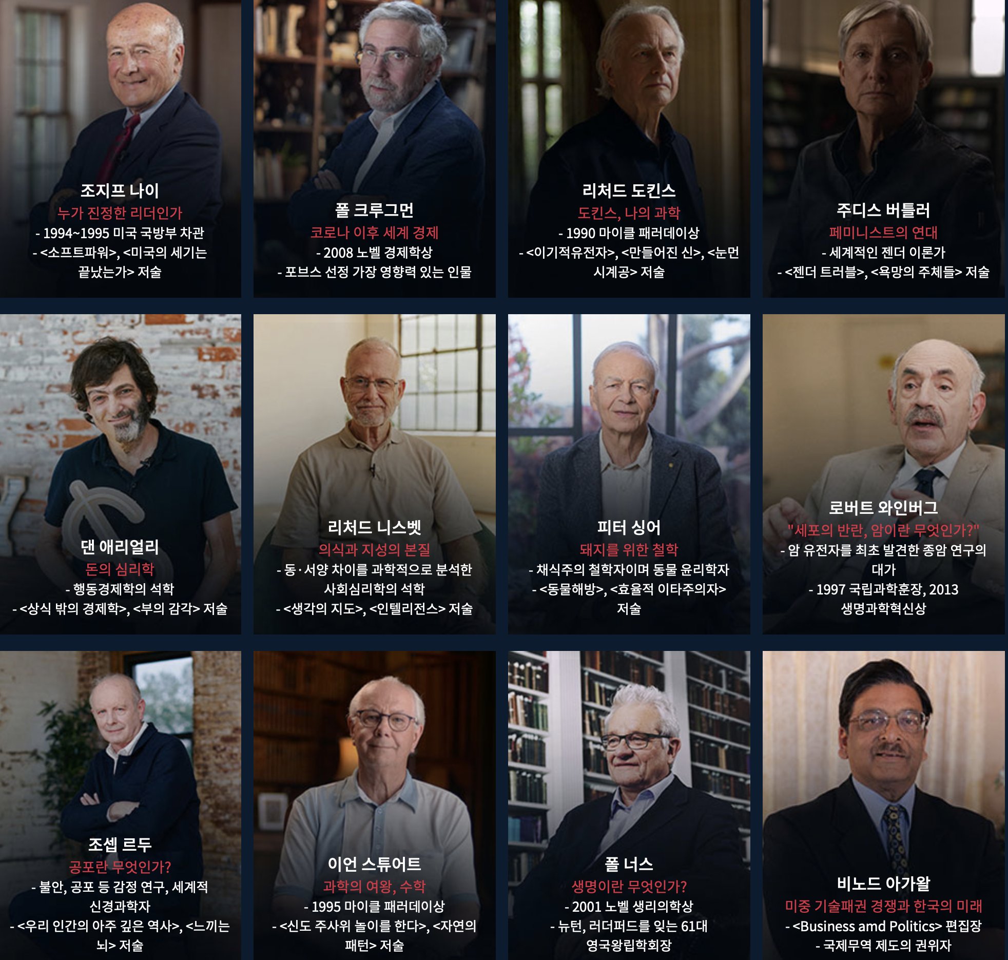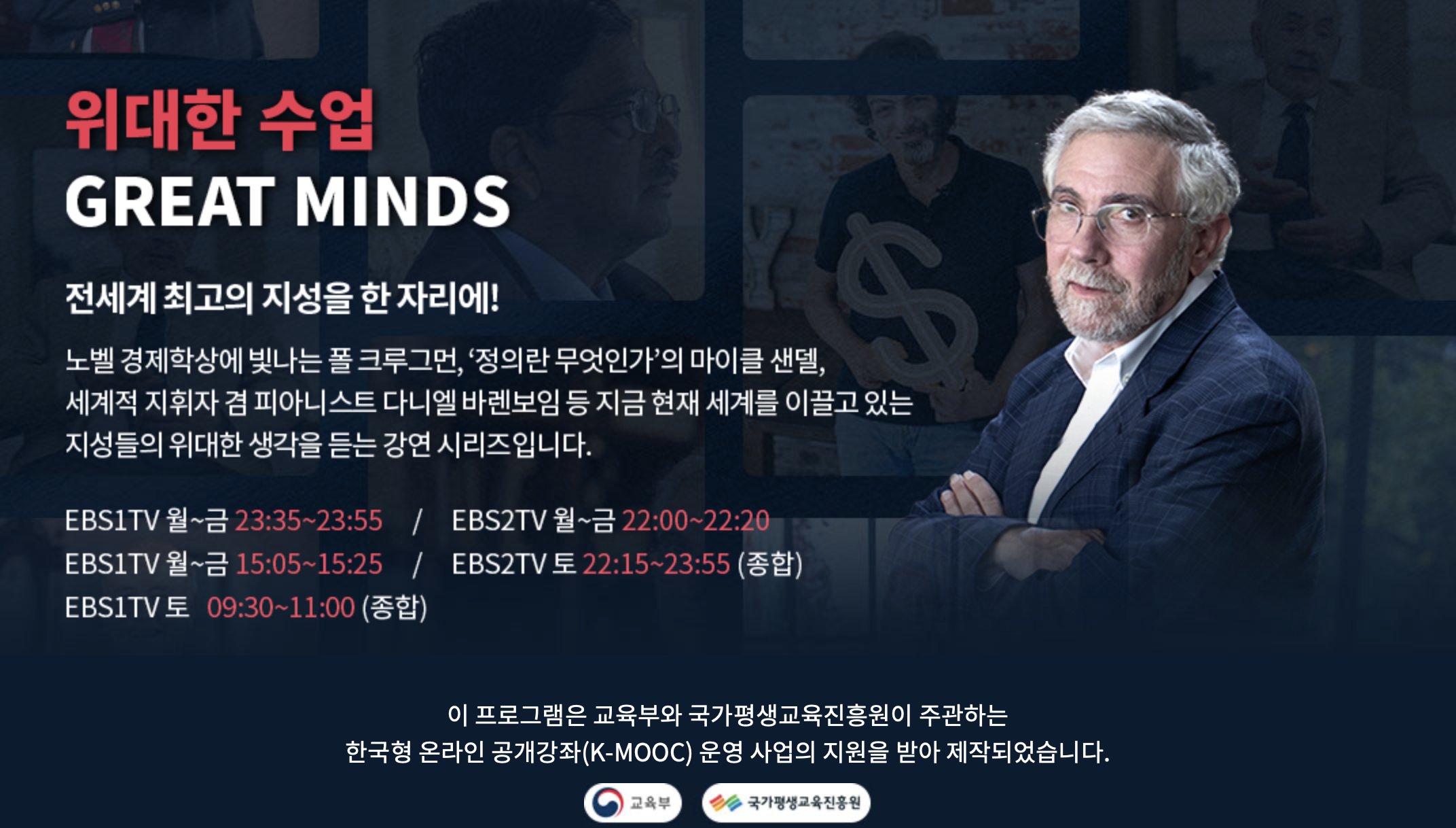 K-MOOC의 새로운 도전 : 대국민 교양 강좌, 세계 석학들의 위대한 수업 유발 하라리, 마이클 센델, 리처드 도킨스, 제레드 다이아몬드 등 현재 세계를 이끌고 있는 지성들이 직접 준비한 명 강연 2021년 8월 30일부터 EBS를 통한 방송 개시, K-MOOC를 통해 동시 수강 가능